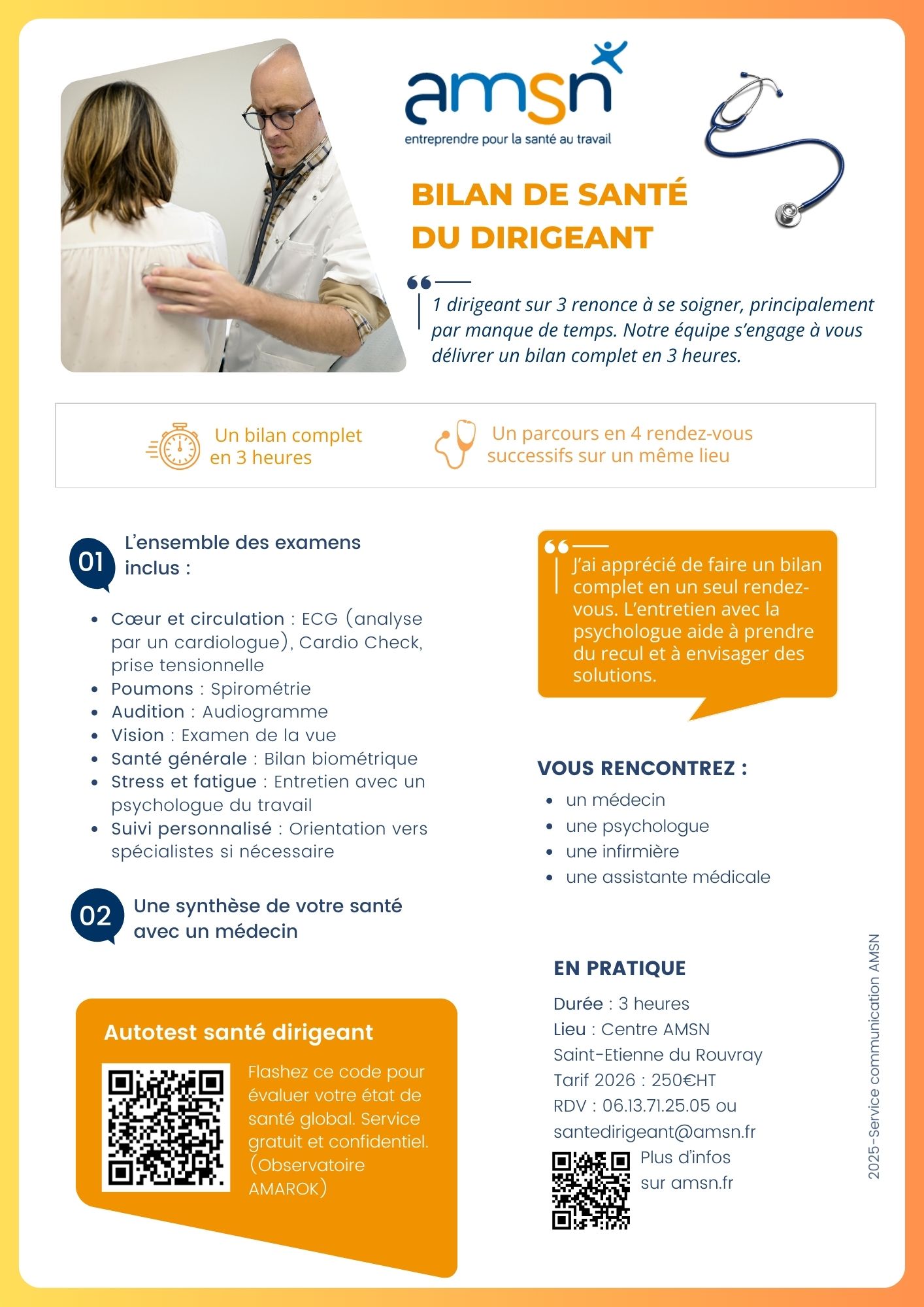 A noter : le check-up AMSN n’est accessible qu’aux dirigeants adhérents (application loi Août 2021). En revanche, tous les travailleurs indépendants peuvent y accéder, sous réserve de signer un contrat d’affiliation avec l’AMSN